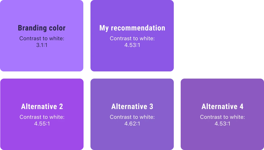 During my evaluation of the company's new branding, I noticed that the new primary color lacked sufficient contrast against white text, which the company wanted for digital content. I generated several contrast-approved alternatives to the primary color in hopes of finding a suitable solution.