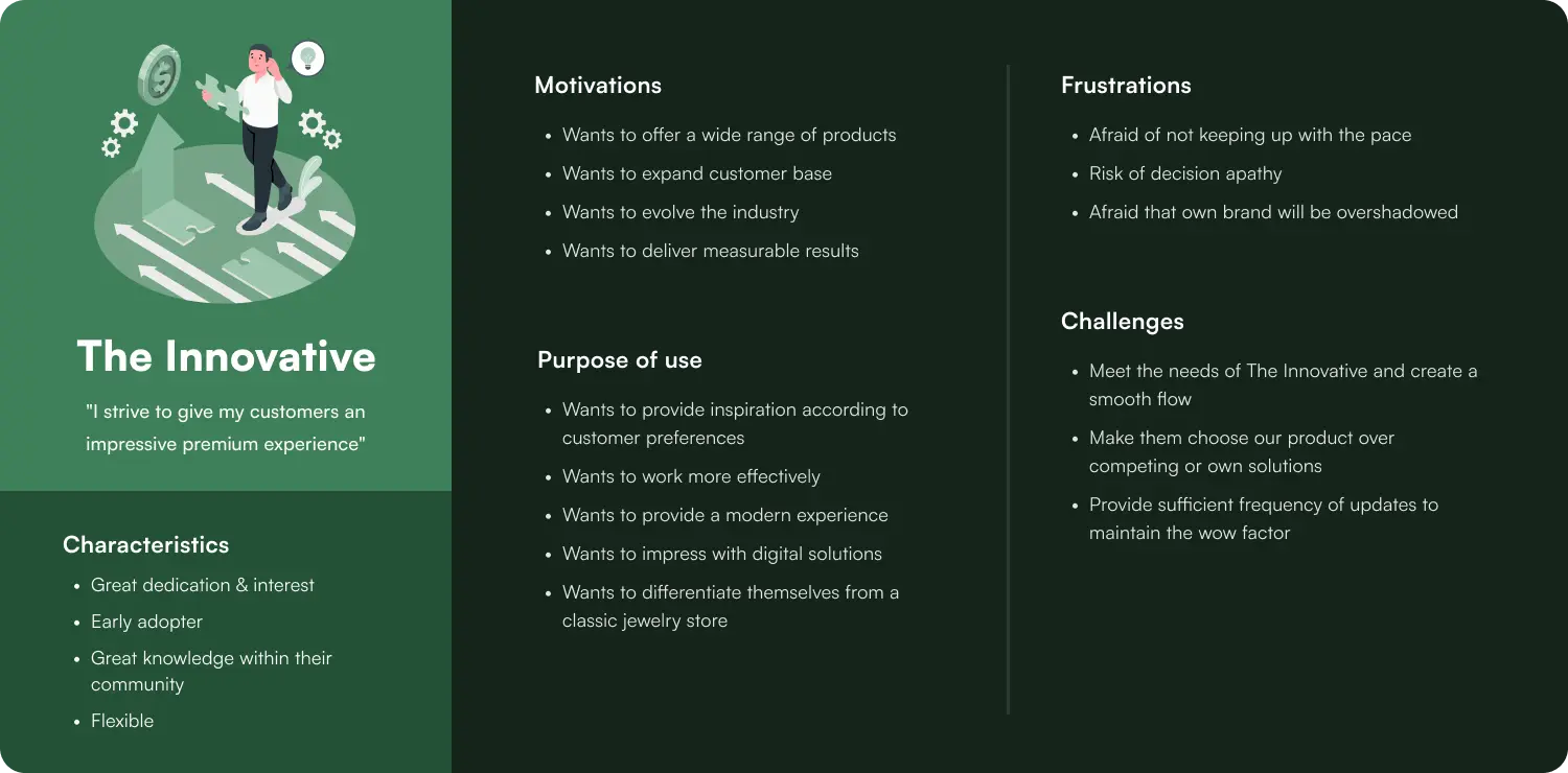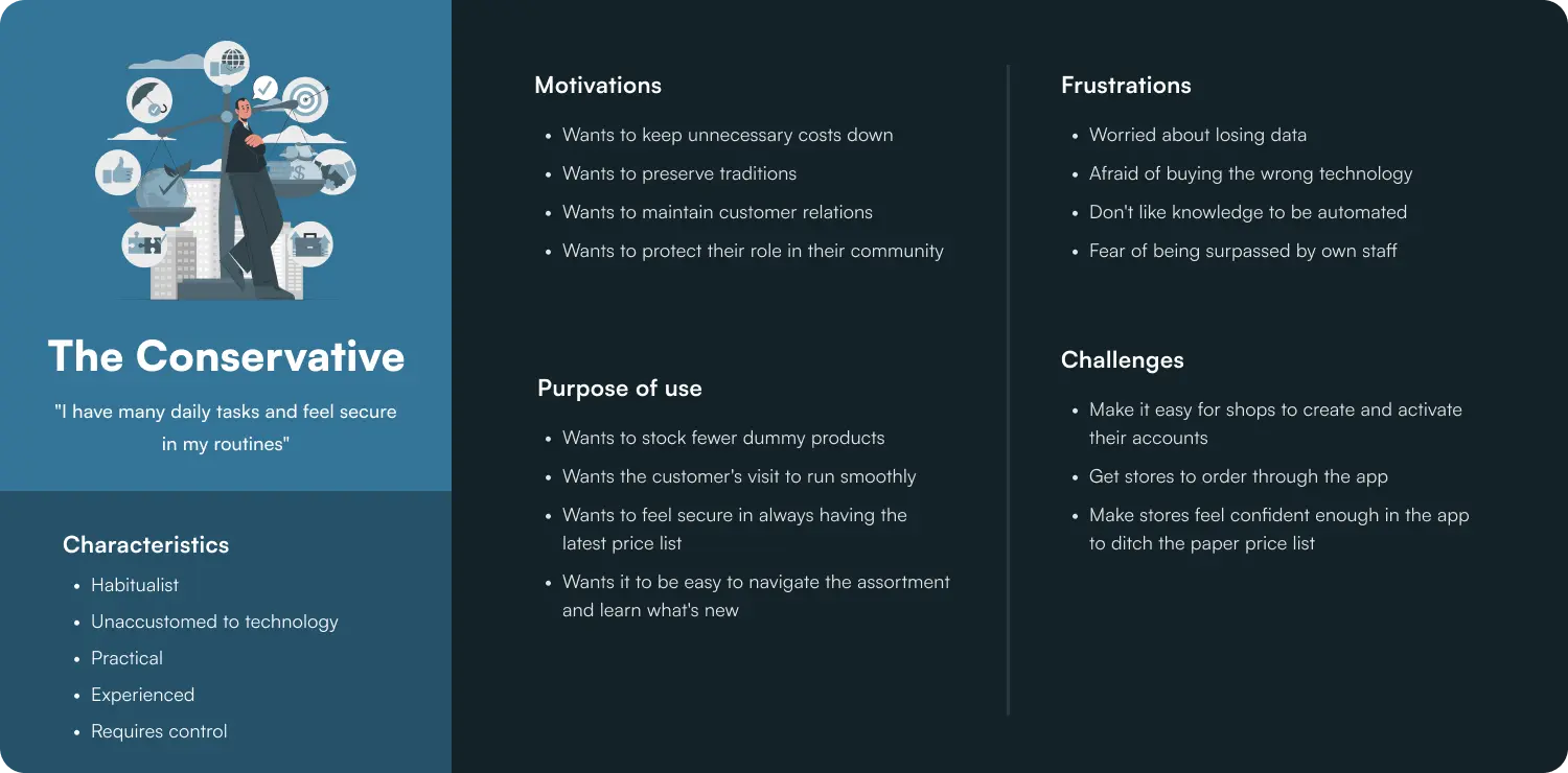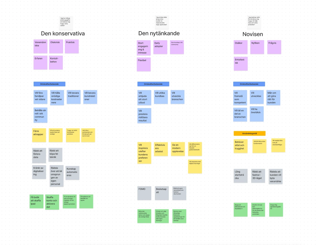 Based on the previously gathered material and the product owner's own knowledge, my team developed three user archetypes. These made it easier for me personally to always keep the user in focus during my work.