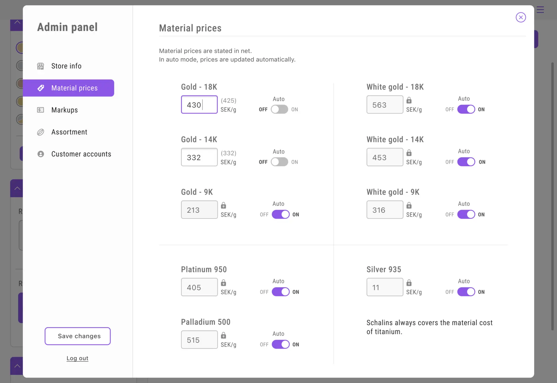 Input fields show clear states (shadow when unlocked, colored frame when active, padlock when locked). Modified price fields display values to the right. Checkboxes became toggles for better usability, and fonts were enlarged for improved readability.