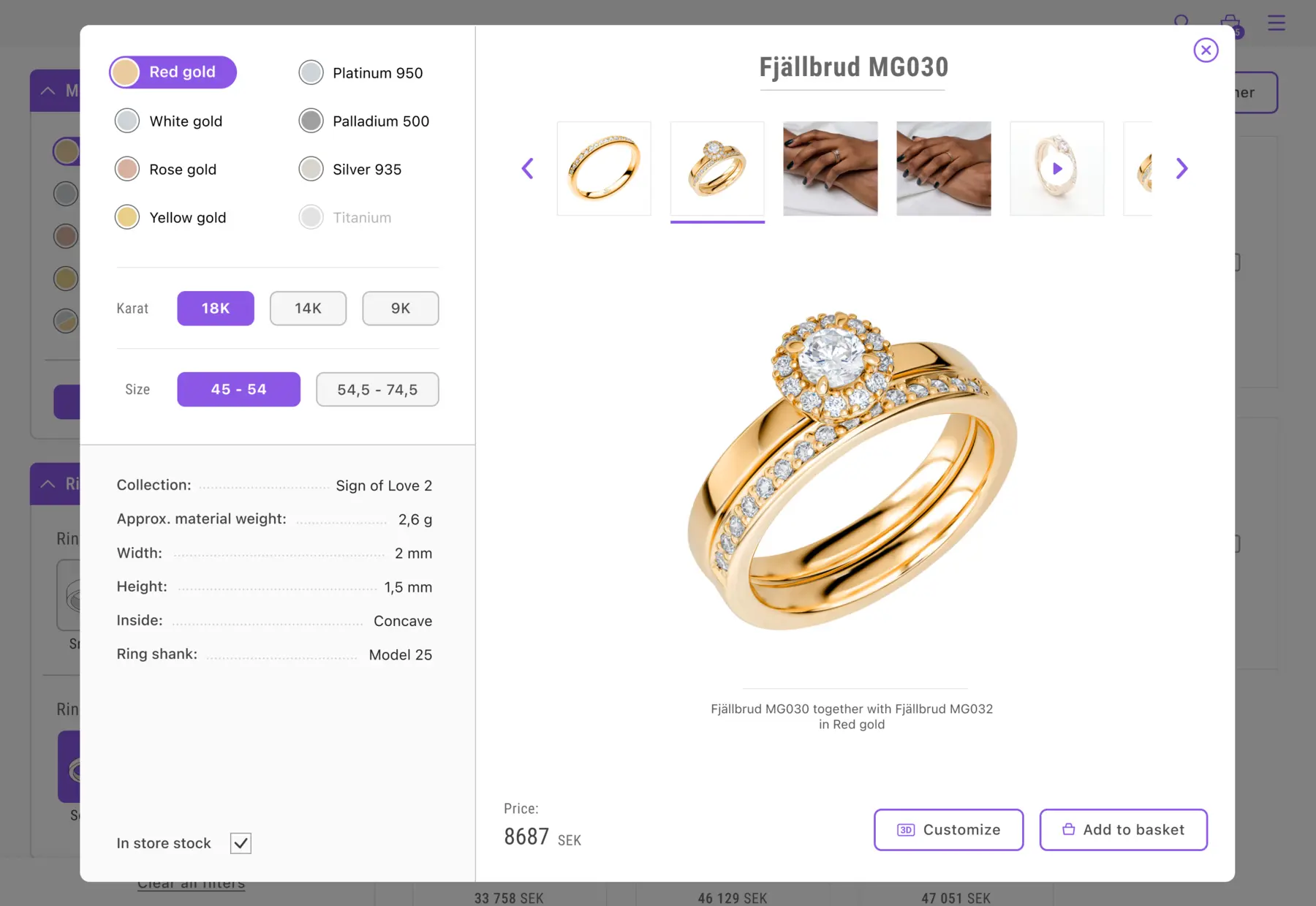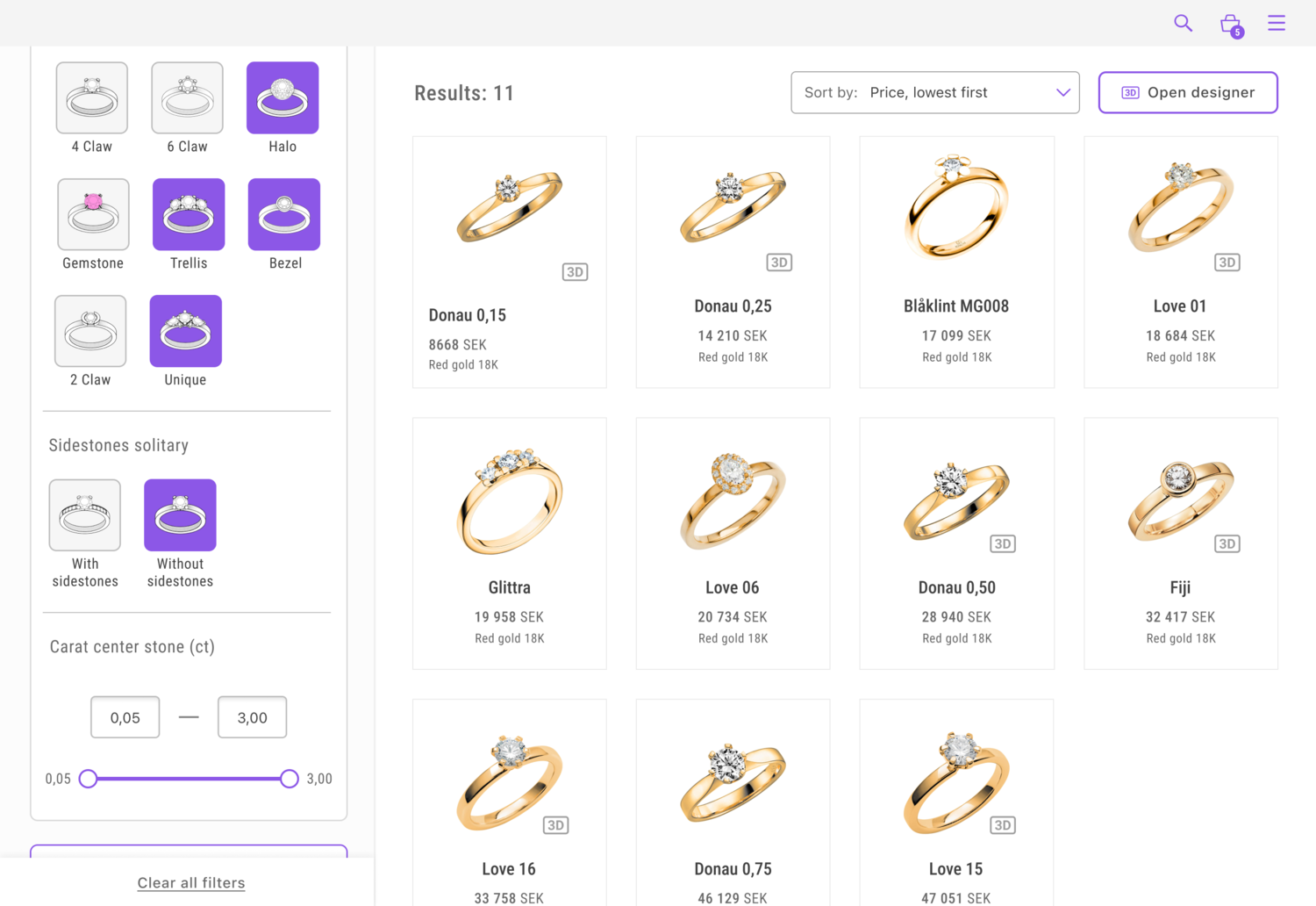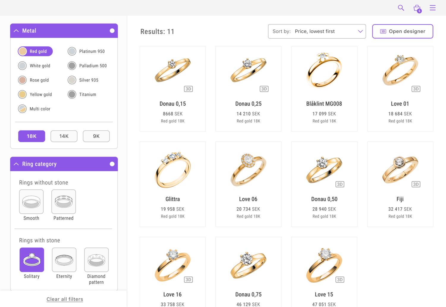 Clearer visual feedback and enlarged hit surfaces for buttons and clickable elements. A more defined hierarchy improved category understanding and filtering visibility. Enhanced result structure, with icons indicating rings that can be modified in 3D designer mode.